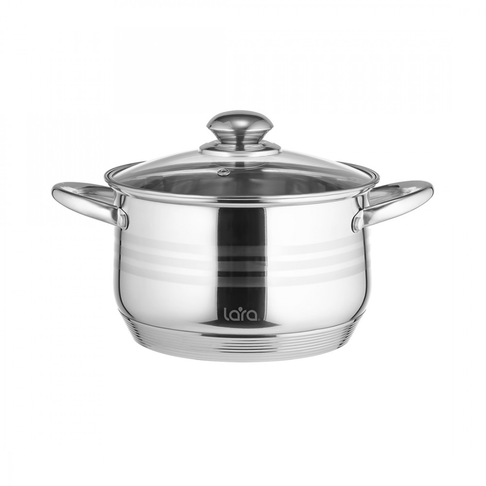 Кастрюля, LARA, SONATA LR02-582, Диаметр 20 см, Высота 12.5 см, Объем 3.9л, Нержавеющая сталь/Стекло, Для всех типов плит, Мойка ручная/в посудомоечной машине, Стальной
