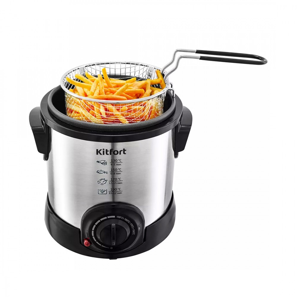 Фритюрница, Kitfort, КТ-2009, Мощность 1000 Вт, Ёмкость 1л, Нержавеющая сталь, Механический тип управления, Максимальная температура 190 °C, Длина шнура 0.92м, Антипригарное покрытие чаши, Регулируемый термостат, Плавная регулировка температуры, Серебристый