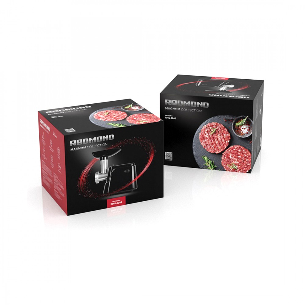 Мясорубка, Redmond, RMG-1246, Мощность 1340 Вт, Производительность 1.6 кг/мин, Количество дисков для фарша 2, Диаметр отверстий диска 5 мм/7 мм, Насадки для кеббе и колбасок, Черный