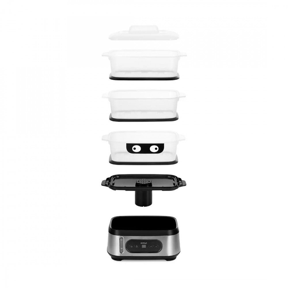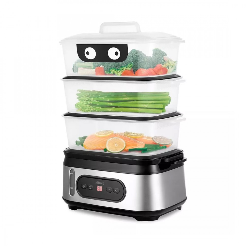 Пароварка, Kitfort, КТ-4082, Мощность 950 Вт, Объем 3 л, Общий объем 9 л, 3 яруса, Таймер 12 ч, Длина шнура 0.7 м, Черный/Стальной