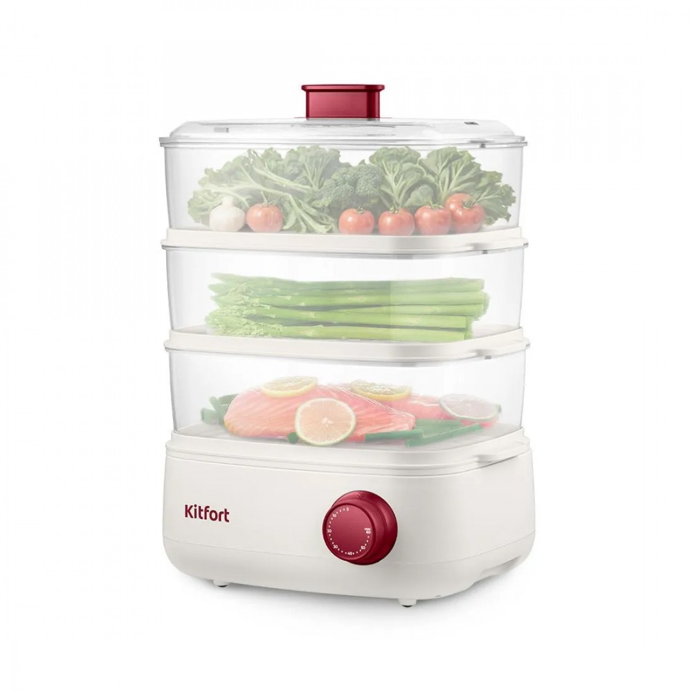 Пароварка, Kitfort, КТ-6830, Мощность 800 Вт, Таймер до 60 мин, 3 паровых отсека, Цвет белый