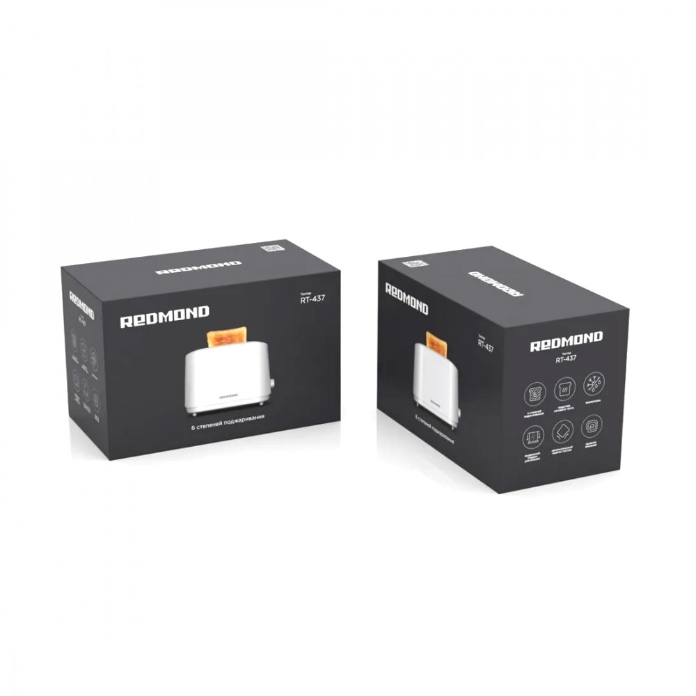Тостер, Redmond, RT-437, 6 степеней обжаривания, 2 отделения для тостов, Функция разморозки и подогрева, Автоматическое центрирование тостов, Функция отмены, Мощность 750 Вт, Длина шнура 0.6м, Белый