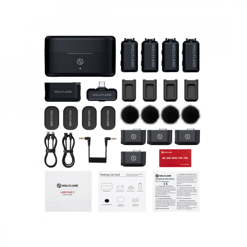Петличный микрофон, Hollyland, Lark MAX 2 Combo 4-Person, Звук студийного качества с технологией MaxTimbre, Встроенная память объемом 8 ГБ для 14-часовой резервной записи, Профессиональное шумоподавление окружающей среды (ENC), Длительность работы 22 часа, Дальность прямой видимости 250 м, Магнитное крепление, Черный