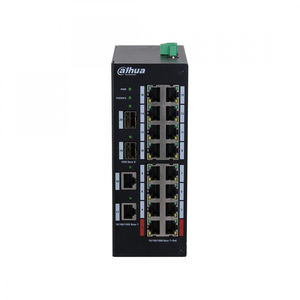 Коммутатор, Dahua, DH-HS3220-16GT-190, Индустриальный, Неуправляемый, 16 портов 10/100/1000Мбит/с (PoE/PoE+/Hi-PoE/IEEE802.3bt до 190Вт), 2 uplink порта SFP,2 uplink порта x 10/100/1000Мбит/с, питание: 48–57 В (DC)