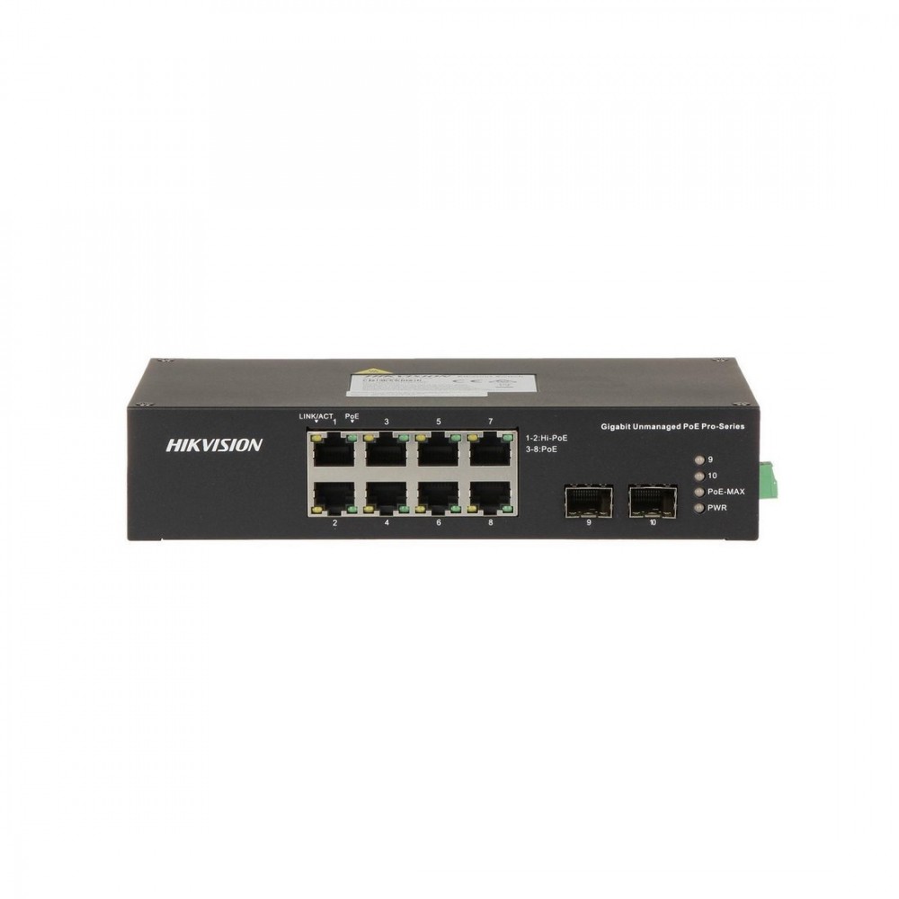 Коммутатор, Hikvision, DS-3T0310HP/No Power unit, Неуправляемый, 8 x 10/100 Mbps, РоЕ 802.3af/at/bt 110W, 1 x Gigabit RJ45, 1 x SFP combo, DIN рейка, Long Range Ports 7 to 8: up to 300 m.