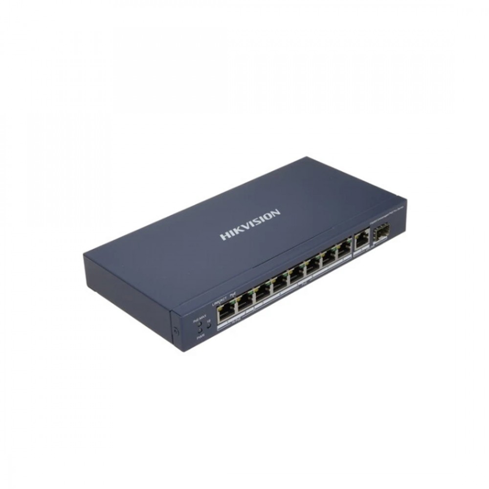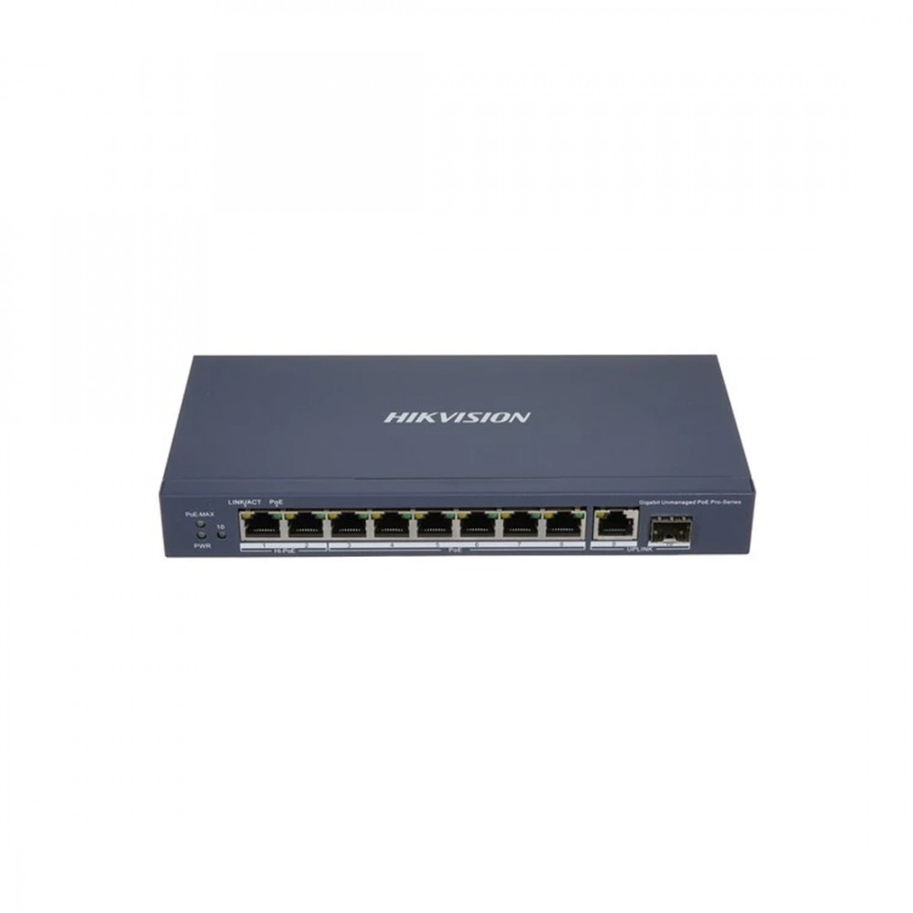 Коммутатор, Hikvision, DS-3E0510HP-E, Неуправляемый, 8 x Gigabit RJ45, РоЕ 802.3af/at/bt 110W, 1 x SFP, 1 x 1000 Mbps RJ45, Настольный, Long Range Ports 7 to 8: up to 300 m.
