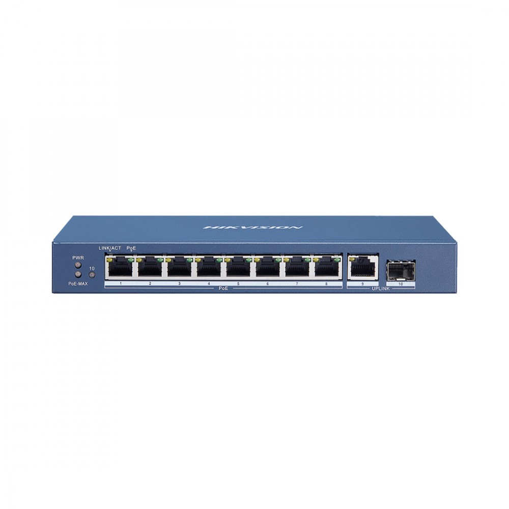 Коммутатор, Hikvision, DS-3E0510P-E(B), Неуправляемый, 8 x Gigabit RJ45, РоЕ 802.3af/at 110W, 1 x Gigabit RJ45, 1 x SFP, Настольный