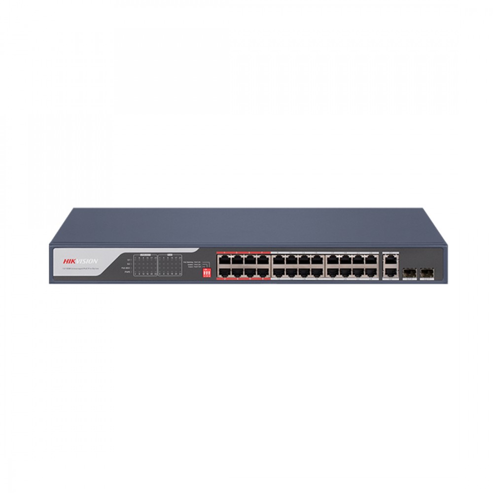 Коммутатор, Hikvision, DS-3E0326P-E(C), Неуправляемый, 24 x 10/100 Mbps, РоЕ 802.3af/at 370W, 2 x Gigabit RJ45, 2 x SFP combo, Стоечный, Long Range Ports 17 to 24: up to 300 m.