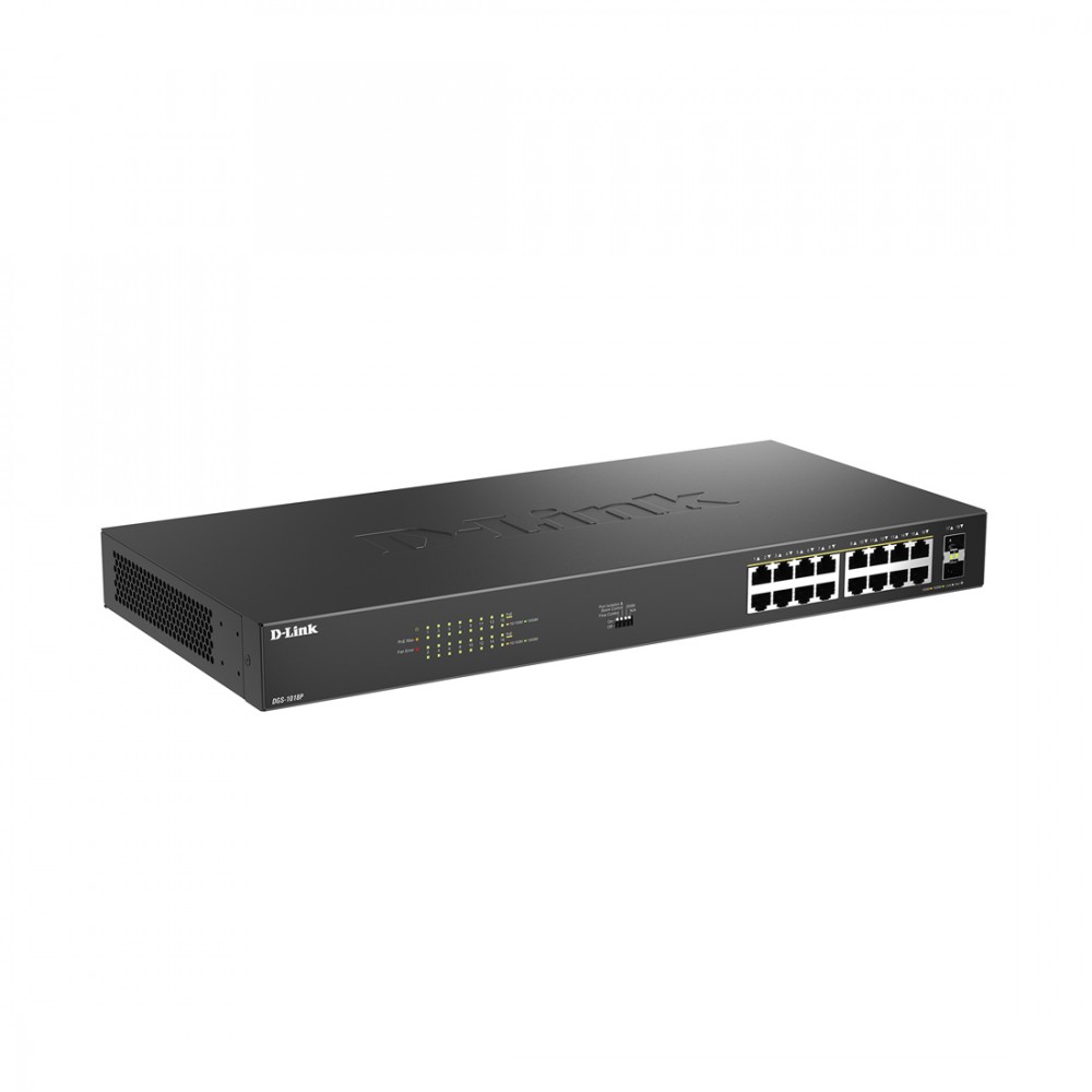 Коммутатор , D-Link, DGS-1018P/B1A, Управляемый, 16 портов PoE 802.3af/at 10/100/1000Base-T, 2 порта 1000Base-X SFP, DIP-переключатели, PoEбюджет 240 Вт