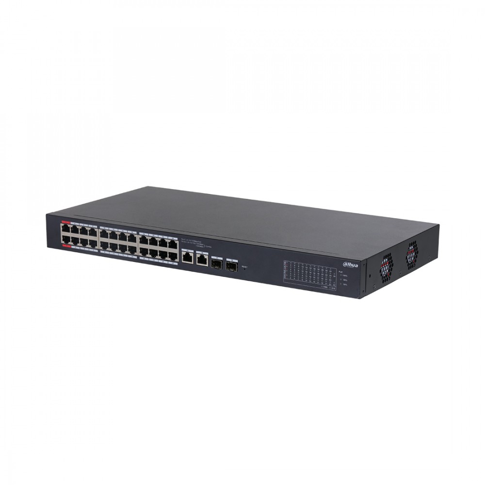 Коммутатор, Dahua, DH-CS4226-24ET-375, Управляемый L2, 24 RJ-45 10/100 Mbps (PoE).total 375 W, 2 RJ-45 10/100/1000 Mbps (combo). 2 SFP 1000 Mbps (combo)